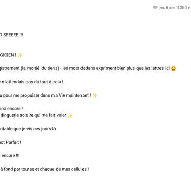 Bon à savoir : Ce moment est souvent thérapeutiques. Généralement, mes clients libèrent des poids du passé, et reviennent l'esprit plus clair sur ce qu'ils veulent manifester. 😌